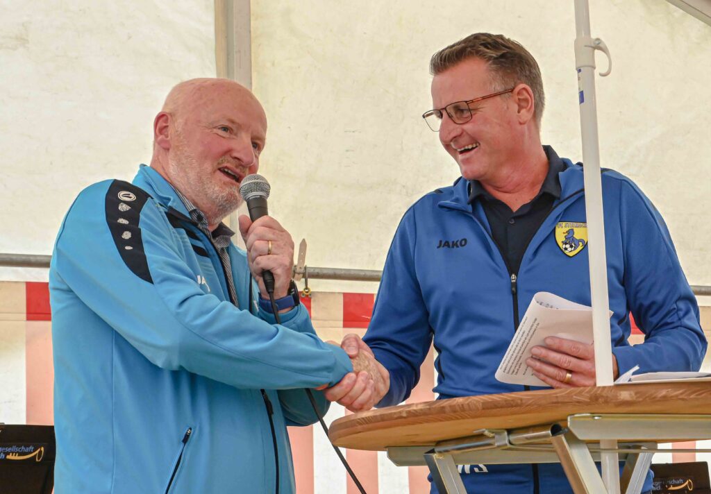 Mit der Anzahl der Ansprachen übte das OK vornehme Zurückhaltung. Doch jene, die gehalten wurde, boten Wissenswertes und ordneten auch ein. OK-Präsident und Speaker Ueli Nägeli warf mit den Aussagen von Wisi Purschke zuerst einen kurzen Blick in die Vergangenheit. Mit Wisi war der letzte Akteur der Gründerzeit am Tisch und er konnte auch einige Aussagen zur damaligen Zeit machen. So sind ihm die Aussagen des damaligen Gemeindeammann Paul Herzog geblieben, der für den Bau des Fussballplatzes gar nichts übrig hatte und auch gegen die Gründung des FC war und diesen als überflüssig wertete. Auch die Mannschaftstrainer wurden von den Spielern selbst finanziert. Nun, die Zeiten haben sich geändert. Der FC Steinach ist inzwischen zum grössten Verein des Dorfes geworden. Diese Tatsache würdigte auch Gemeindepräsident Michael Aebisegger in seiner Ansprache. Er erwähnte die Jugendarbeit sowie auch den Umstand, dass der FC mittlerweile für Steinach und für die Gesellschaft von erheblicher Wichtigkeit sei. Und die eventuellen Rivalitäten unter den Menschen sollten auf dem Sportplatz ausgefochten werden und nicht auf der Strasse.