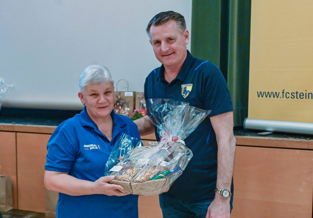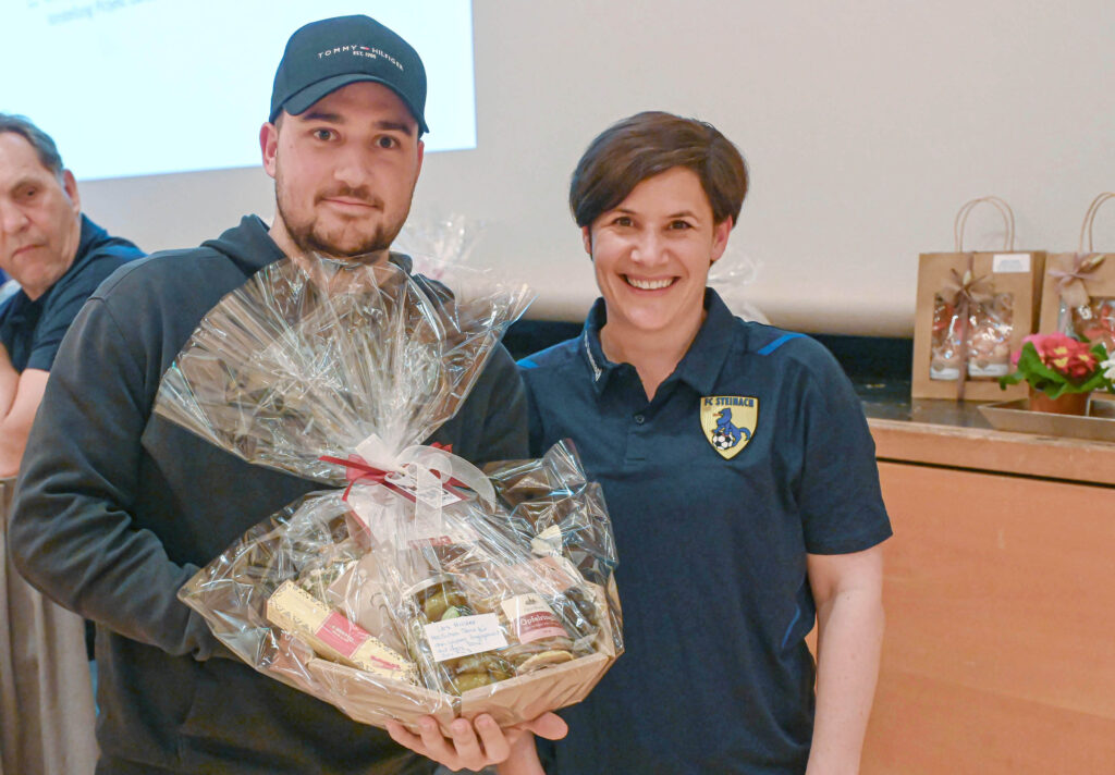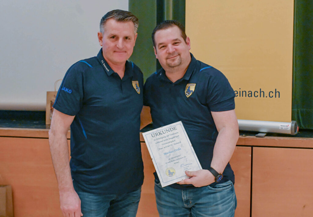 Wie bereits der Präsident betonte, sind die vereinseigenen Veranstaltungen im finanziellen Bereich ein Hit. Das konnte man auch dem Kassabericht von Kassierin Daniela Würth entnehmen, der mit einem guten Jahresgewinn abgeschlossen hatte. Eine Budgetkürzung erfolgte im Bereich Trainingslager. „Das Ergebnis entsprach nicht den Erwartungen“, sagte Steiger. Zwei Mutationen hat der FC-Vorstand zu verzeichnen: den Rücktritt von Aktuarin Diana Seifert und von Senioren-Veteranenobmann Hansruedi Maag. Zur Verfügung gestellt und gewählt wurden Sandra Wey als Aktuarin und Luca Rivetti als Senioren-Veteranenobmann. Im Weiteren erfolgte die Verabschiedung des Schreibenden (und Fotografierenden), der nach über zehnjähriger Tätigkeit für den FC Steinach altershalber etwas kürzer treten will. Nebst etlichen Ehrungen erfolgte mit einstimmigem Mehr die Vergabe der Ehrenmitgliedschaft an das Vorstandsmitglied und ehemaligen Trainer der ersten Mannschaft Mathias Drdla.
